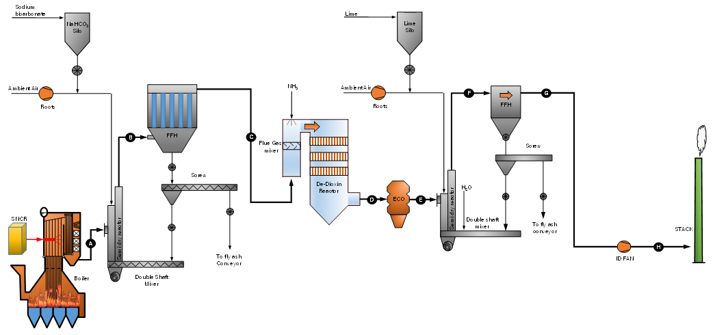 采用SNCR+SDS干法+除塵器+SCR+ECO+干法+布袋除塵器的組合工藝,實現固體廢棄物焚燒尾氣的超凈排放和煙氣消白。
