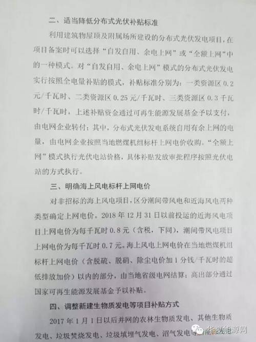 根據當前新能源產業技術進步和成本降低情況,適當降低保障性收購范圍內2018年新建陸上風電和2017年新建光伏發電等新能源標桿上網電價,具體見附件一。光伏發電、陸上風電上網電價在當地燃煤機組標桿上網電價(含脫硫、脫硝、除塵電價加1分錢/千瓦時的