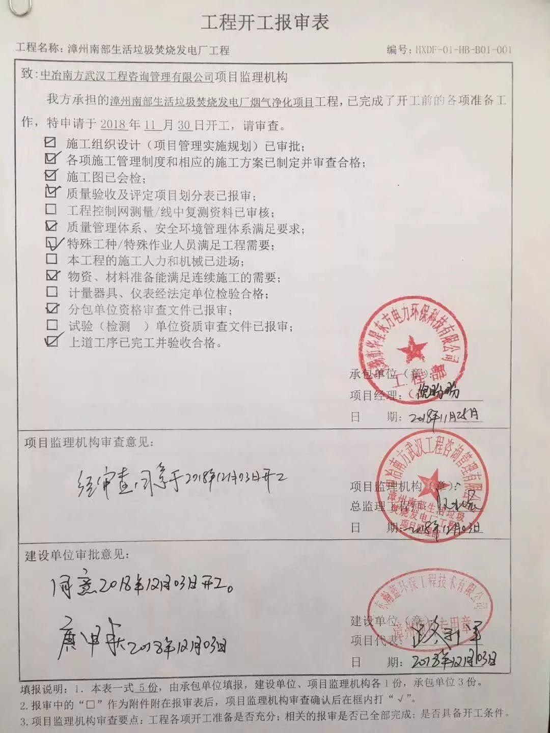 2018年12月3日,我司承建的漳州南部2x500t/d生活垃圾焚燒發電項目煙氣凈化工程獲批開工建設。本項目為2套單臺日處理能力為500t的垃圾焚燒生產線,2臺12MW汽輪發電機組,年處理生活垃圾總量36.6萬噸。本工程煙氣凈化系統采用SNCR爐內脫硝+旋轉噴霧半干法脫酸+干法消石灰噴射+活性炭噴射+布袋除塵器+飛灰輸送等工藝,為我公司EPC項目。