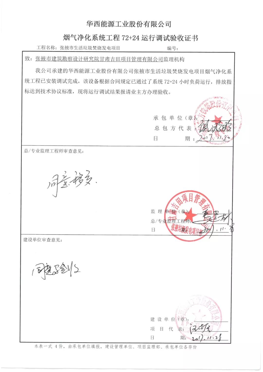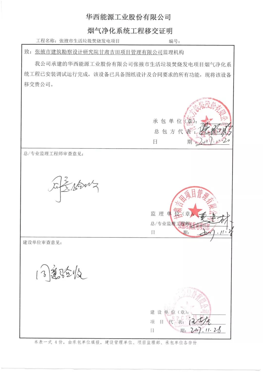 甘肅張掖2x300t/d垃圾焚燒發電項目煙氣凈化工程通過竣工驗收公示