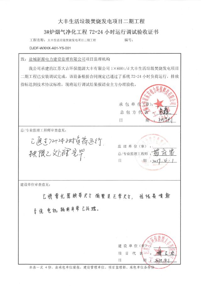 江蘇大豐1x600t/d生活垃圾焚燒發(fā)電項(xiàng)目二期工程3#爐煙氣凈化工程已安裝調(diào)試完成并于2019年4月1日通過(guò)72+24小時(shí)驗(yàn)收。