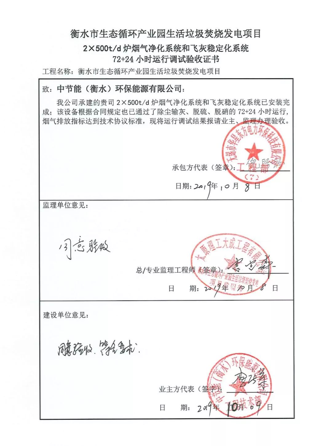我公司承建的衡水市生態循環產業園生活垃圾焚燒發電項目煙氣凈化工程于2019年10月9日通過竣工驗收。
