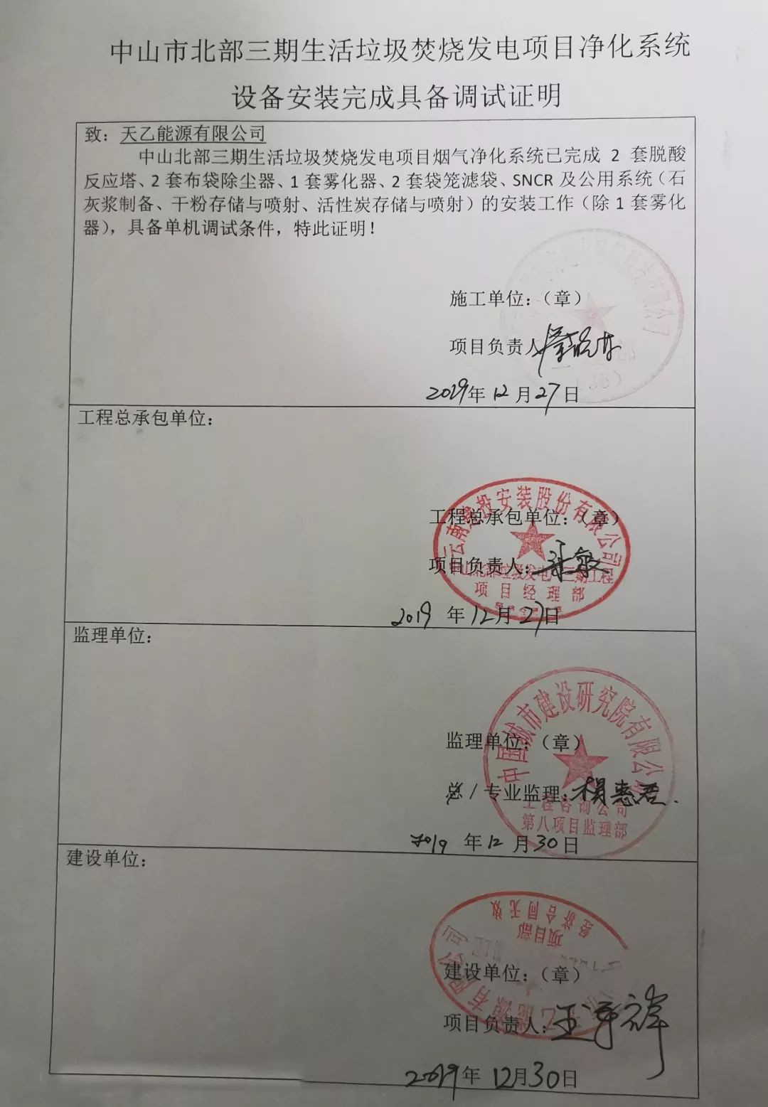 我公司承建的中山市北部垃圾綜合處理基地垃圾焚燒發電廠和垃圾滲濾液處理廠三期工程于2019年12月30日通過調試驗收。