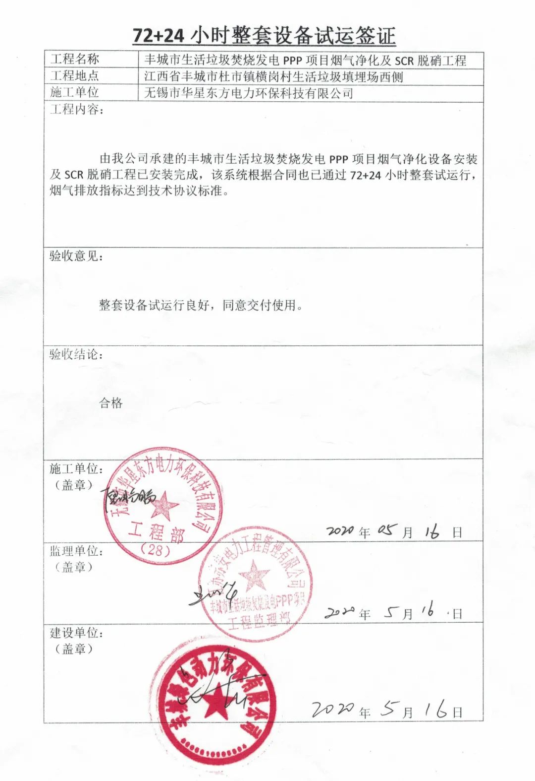 我公司承建的江西省豐城市生活垃圾焚燒發(fā)電PPP項(xiàng)目煙氣凈化工程于2020年05月16日通過72+24小時(shí)運(yùn)行驗(yàn)收。