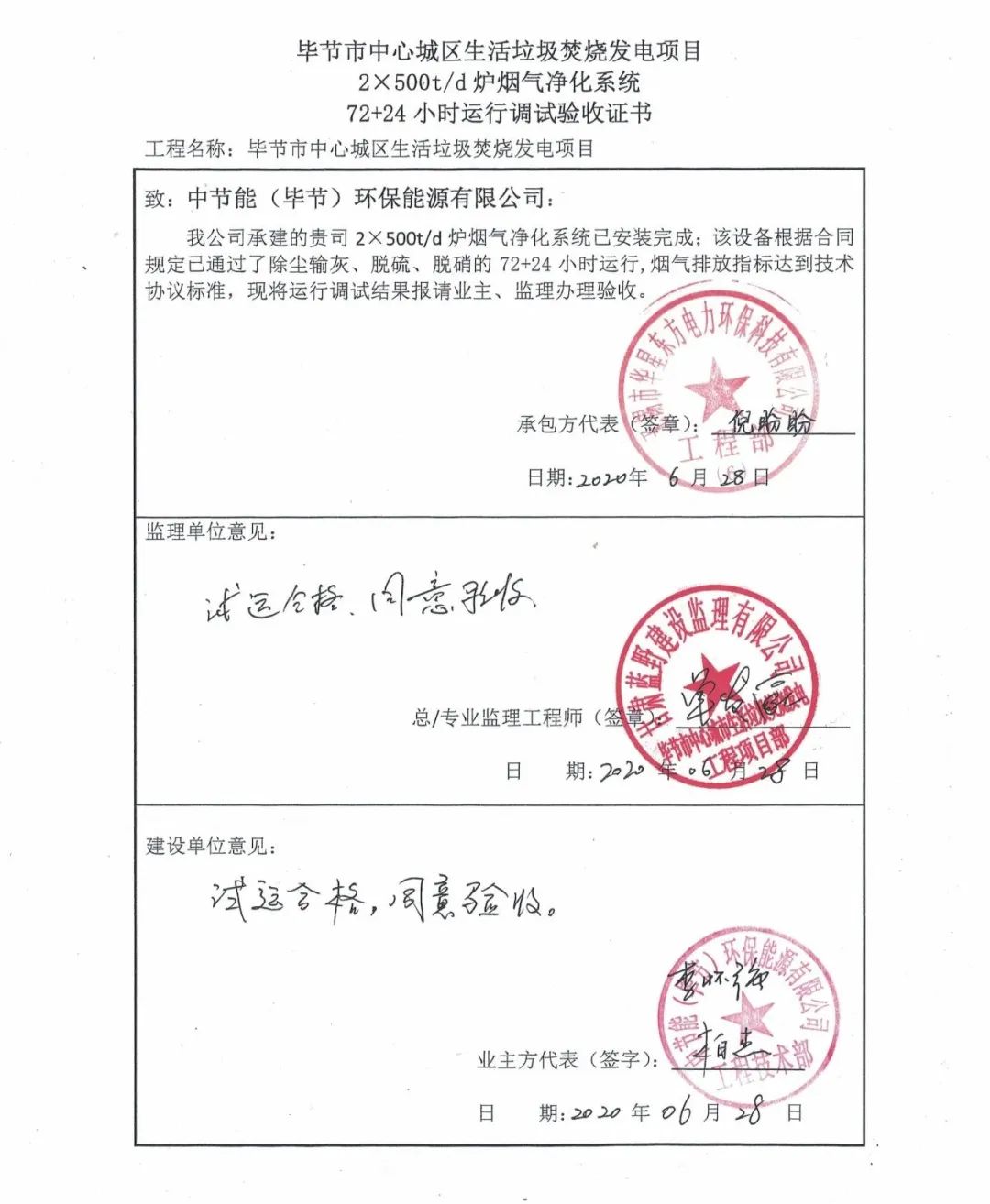 我公司承建的貴州省畢節(jié)市中心城區(qū)生活垃圾焚燒發(fā)電項目煙氣凈化工程于2020年6月28日通過72+24小時試運行。