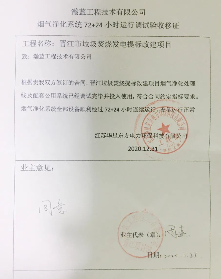 華星東方承建的福建省晉江市垃圾焚燒發電提標改建項目煙氣凈化工程通過72+24小時試運行