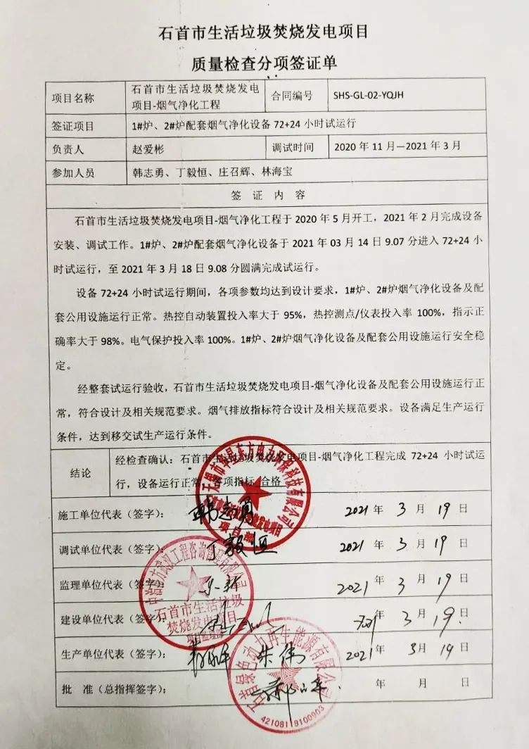 我公司承建的湖北省石首市生活垃圾焚燒發電項目煙氣凈化工程于2021年3月18日通過72+24小時試運行。