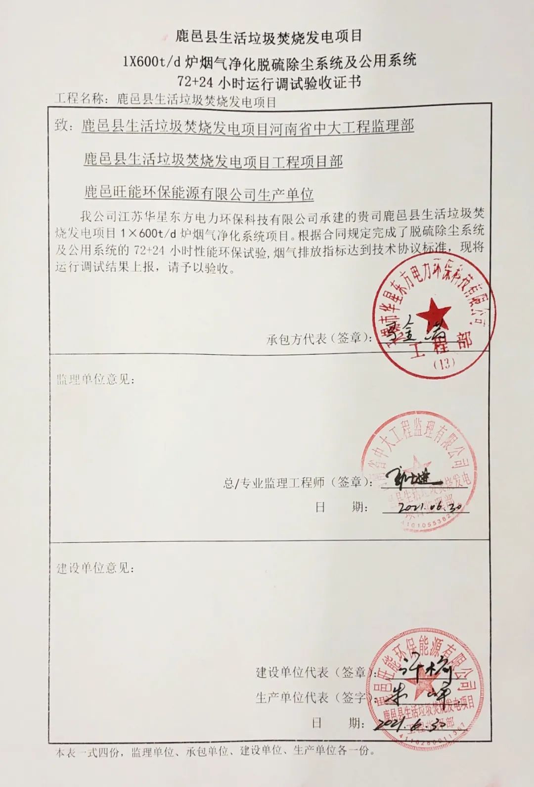 我公司承建的河南省周口市鹿邑縣生活垃圾焚燒發電項目煙氣凈化工程于2021年6月30日通過72+24小時試運行。
