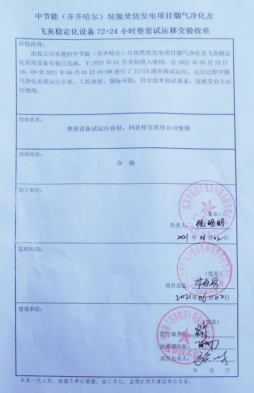 我公司承建的黑龍江省齊齊哈爾垃圾焚燒發電項目煙氣凈化工程于2021年6月2日通過72+24小時試運行。
