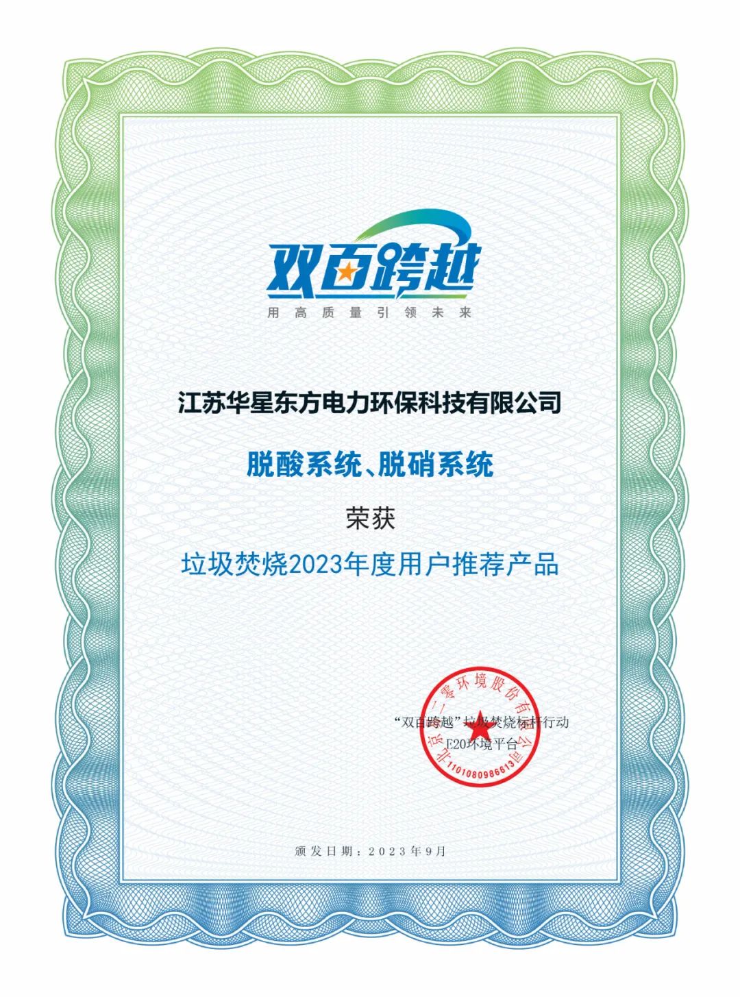 江蘇華星東方在E20環(huán)境平臺2023(第十屆)上海固廢熱點論壇現(xiàn)場揭曉的垃圾焚燒領域關鍵裝備產品“年度用戶提名產品品牌”與“年度用戶推薦產品”兩大產品名錄中榮獲垃圾焚燒(脫酸系統(tǒng)、脫硝系統(tǒng))2023年度用戶推薦產品! Jiangsu Huaxing East Co. won the title of Waste Incineration (Waste Incineration) in the two product lists of "User Nominated Product Brand of the Year" and "User Recommended Product of the Year" for key equipment products in the field of waste incineration, which was announced at the E20 Environmental Platform 2023 (10th) Shanghai Solid Waste Hotspot Forum. Deacidification system, denitrification system) 2023 user recommended products!