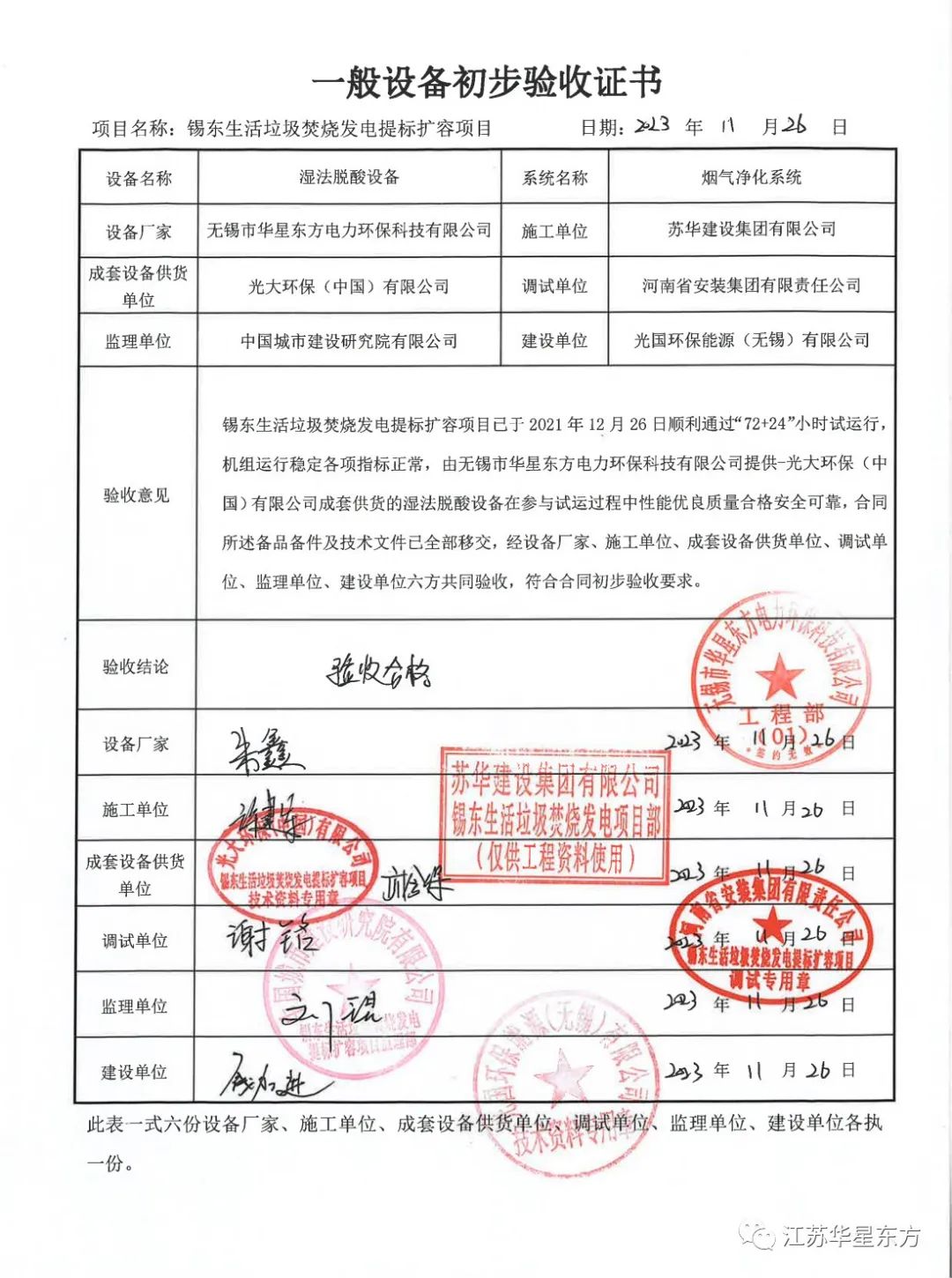 華星東方承建的江蘇省無錫市錫東垃圾焚燒發(fā)電項目煙氣凈化工程通過72+24小時試運行