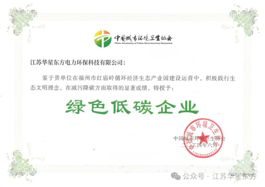 Jiangsu Huaxing East Environmental Protection Technology Co., Ltd. was awarded the "Green and Low-carbon Enterprise" honorary certificate issued by the China Urban Environmental Sanitation Association at this conference, and the equipment supply project undertaken by the company, the Fuzhou Hongmiaoling Waste Comprehensive Treatment Center, was awarded the honorary title of "National AAA-level Domestic Waste Incineration Plant". (Article jump: The flue gas cleaning project of the Hongmiaoling Domestic Waste Incineration Power Generation Project in Fuzhou, Fujian Province, undertaken by Huaxing East Co., passed the 72+24-hour trial operation) fully affirmed the company's remarkable achievements in practicing the concept of ecological civilization and reducing pollution and carbon emissions in the construction and operation of the Hongmiaoling Economic Park.