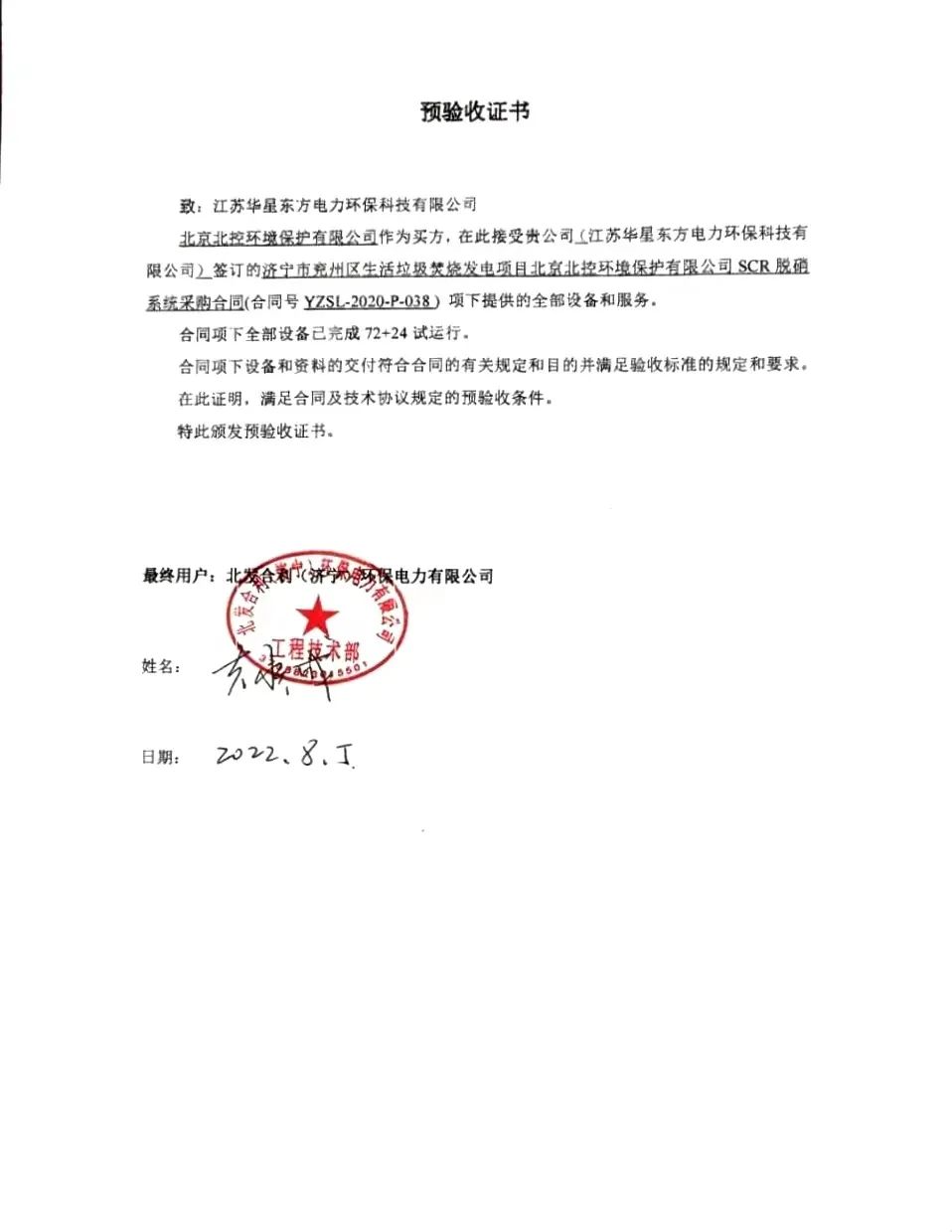 The flue gas cleaning (FGC) project undertaken by Huaxing East for the municipal waste incineration plant in Yanzhou Jining, Shandong passed the 72 + 24 hours trial operation on August 5, 2022.