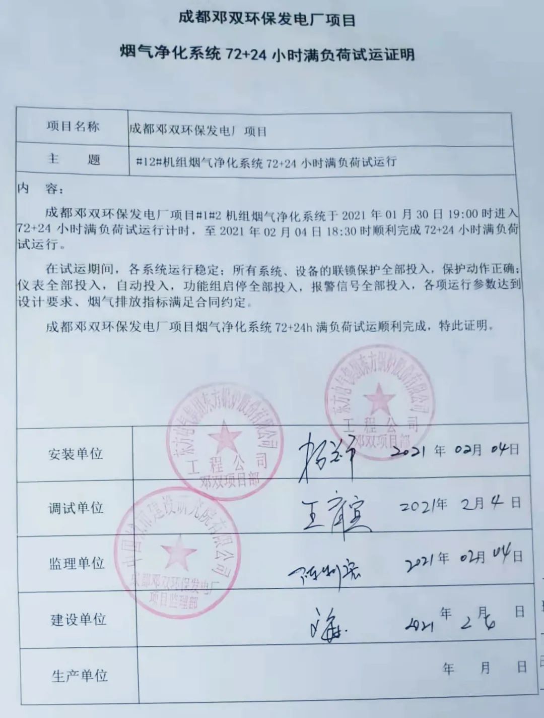 我公司承建的四川省成都市鄧雙環(huán)保發(fā)電廠項(xiàng)目煙氣凈化工程于2021年2月4日通過72+24小時(shí)試運(yùn)行。