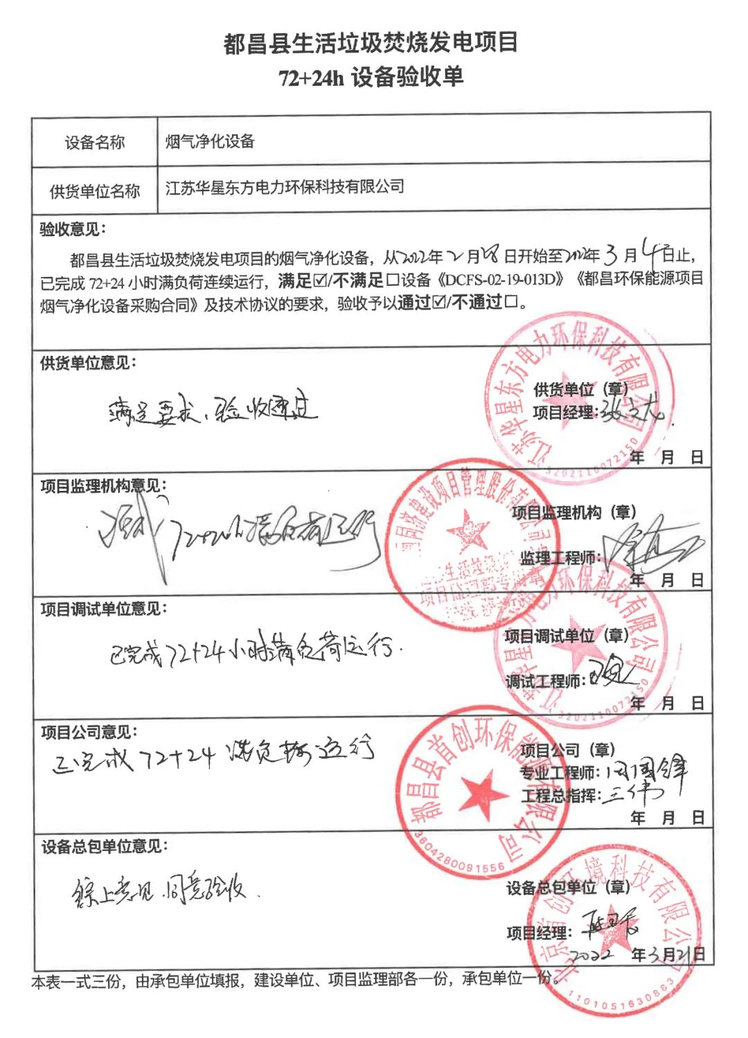 我公司承建的江西省九江市都昌縣生活垃圾焚燒發電項目煙氣凈化工程于2022年3月21日通過72+24小時試運行。