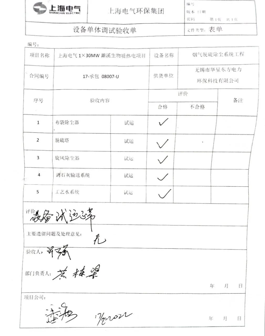 The flue gas cleaning (FGC) project undertaken by Huaxing East for Suixi Biomass Power Plant in Huaibei, Anhui passed the commissioning acceptance on August 17, 2022.