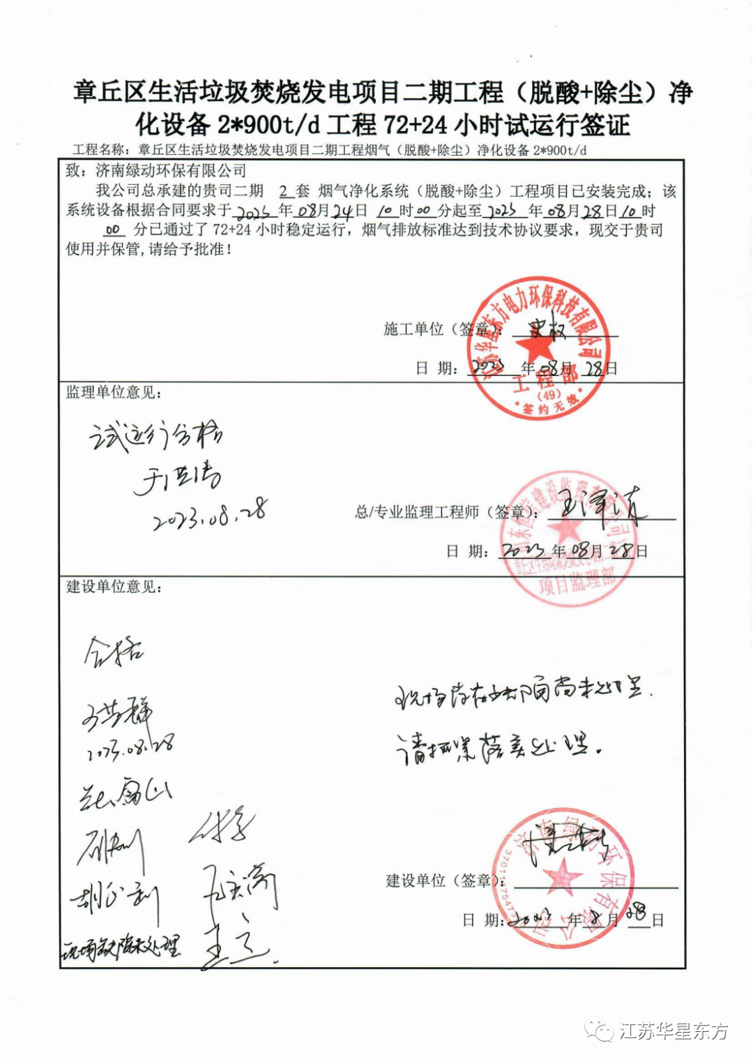 The flue gas cleaning project of the second phase of Zhangqiu household waste incineration power generation project in Jinan city, Shandong province, which was constructed by our company, passed the 72+24 hours trial operation on August 28th, 2023.