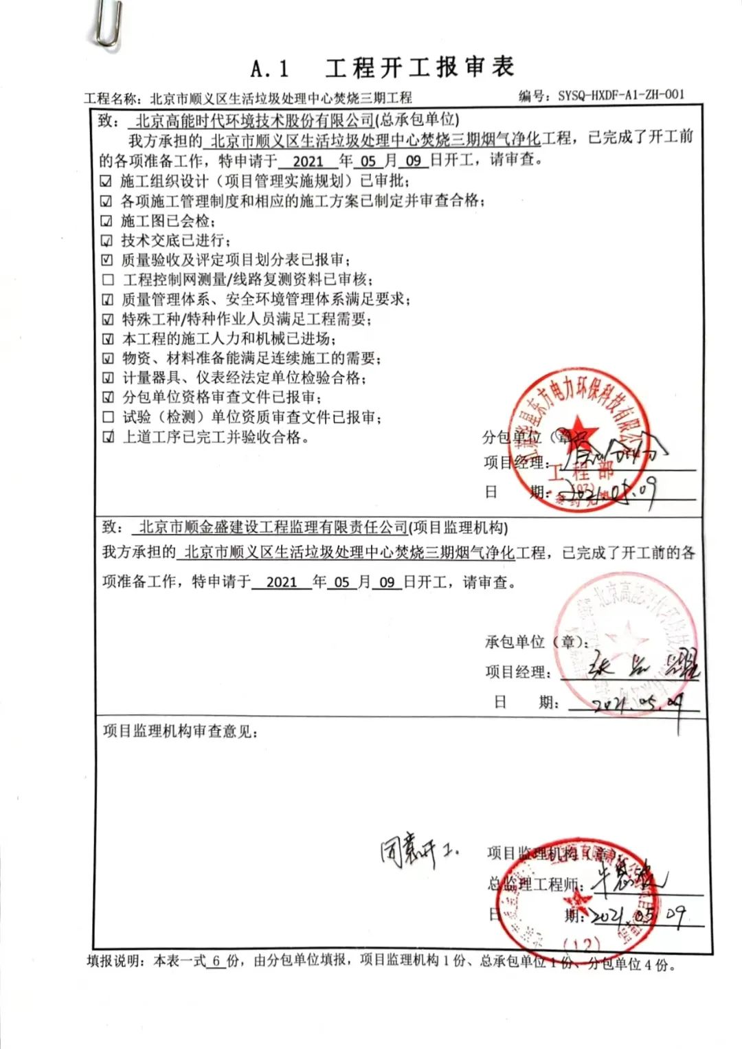 The flue gas cleaning (FGC) project undertaken by Huaxing for Shunyi WTE Phase III in Beijing was commenced on May 9, 2021.
