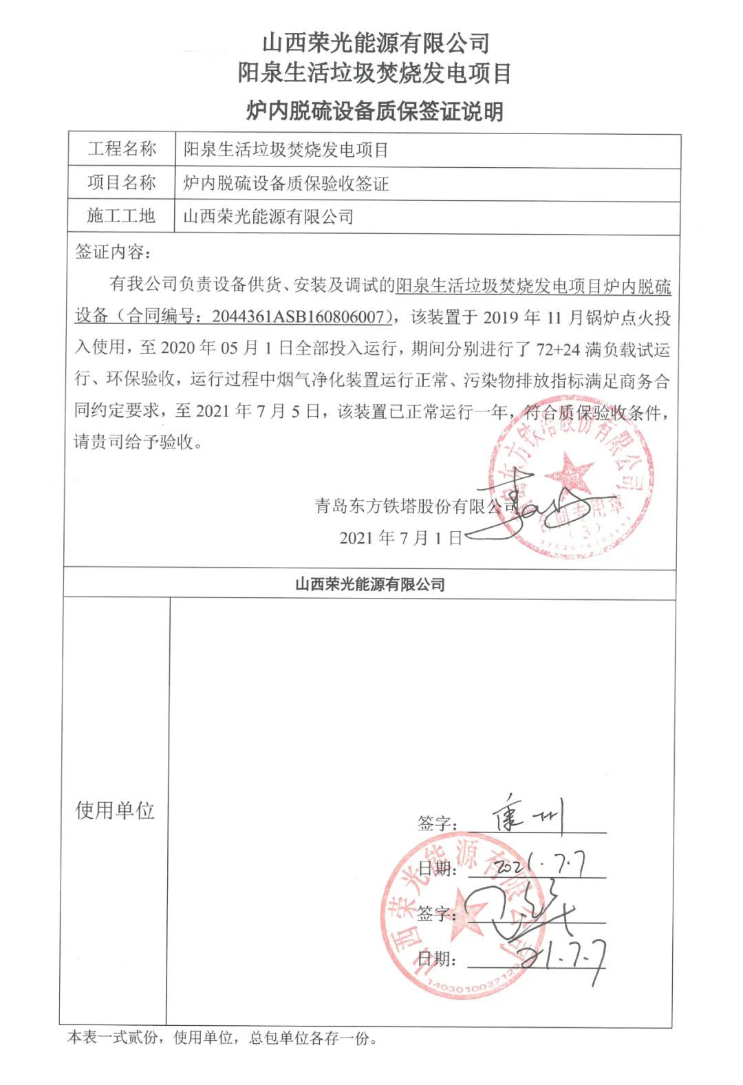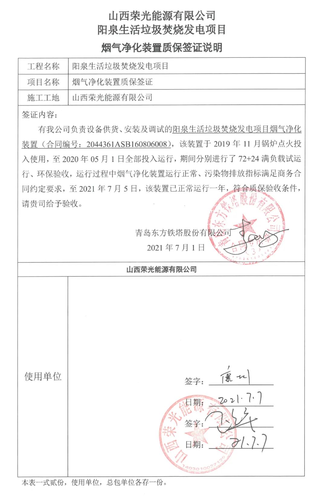我公司承建的山西省陽泉生活垃圾焚燒發電項目煙氣凈化工程于2021年7月1日通過72+24小時試運行。