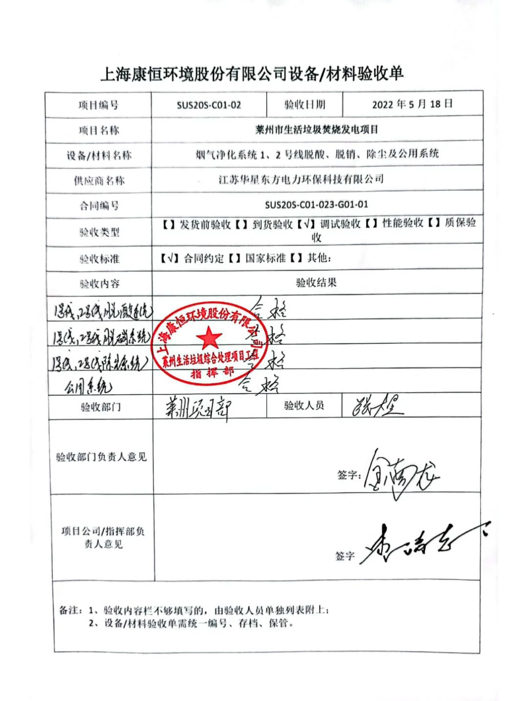 我公司承建的萊州市生活垃圾焚燒發電項目煙氣凈化工程于2022年5月18日通過72+24小時試運行。