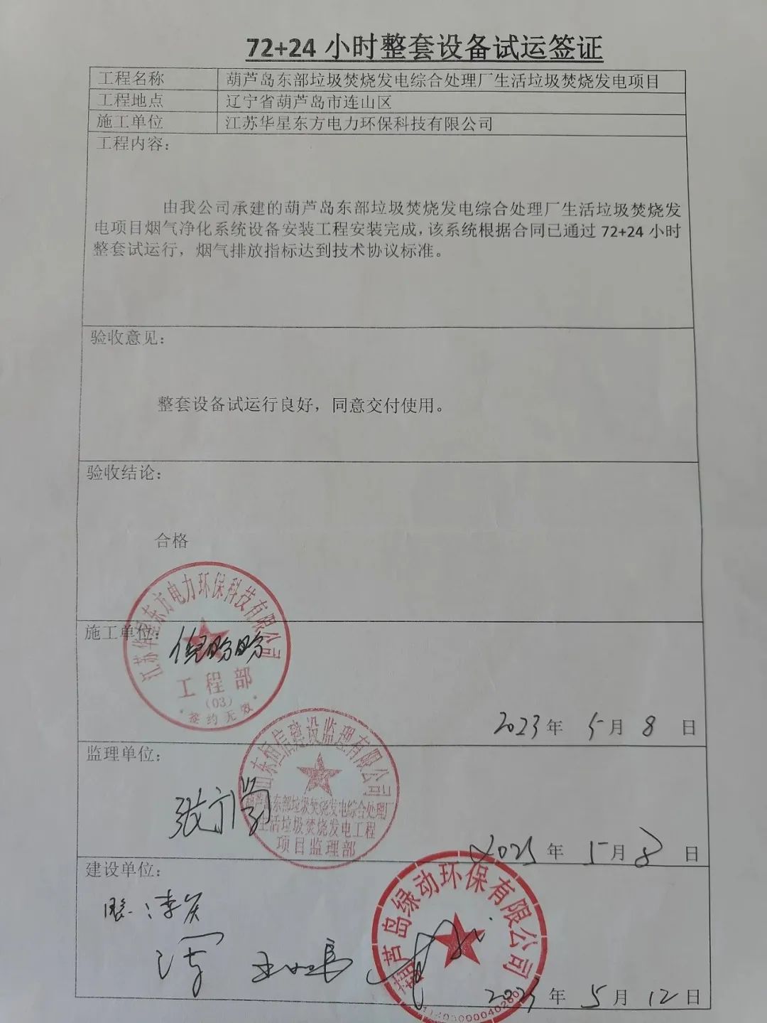 The flue gas cleaning (FGC) project undertaken by Huaxing-east for the waste incineration power plant in Huludao, Liaoning has passed 72+24 hours of trial operation