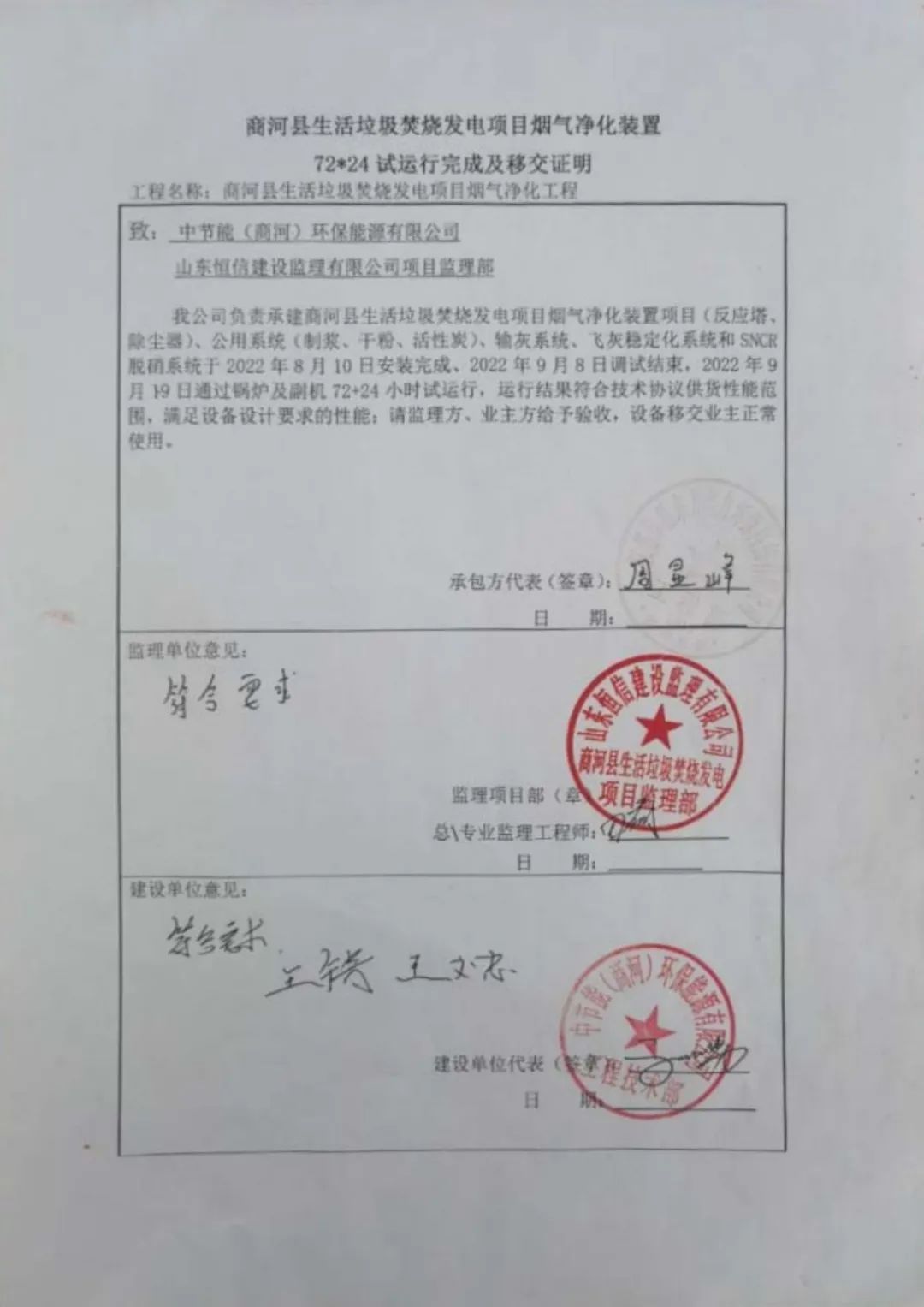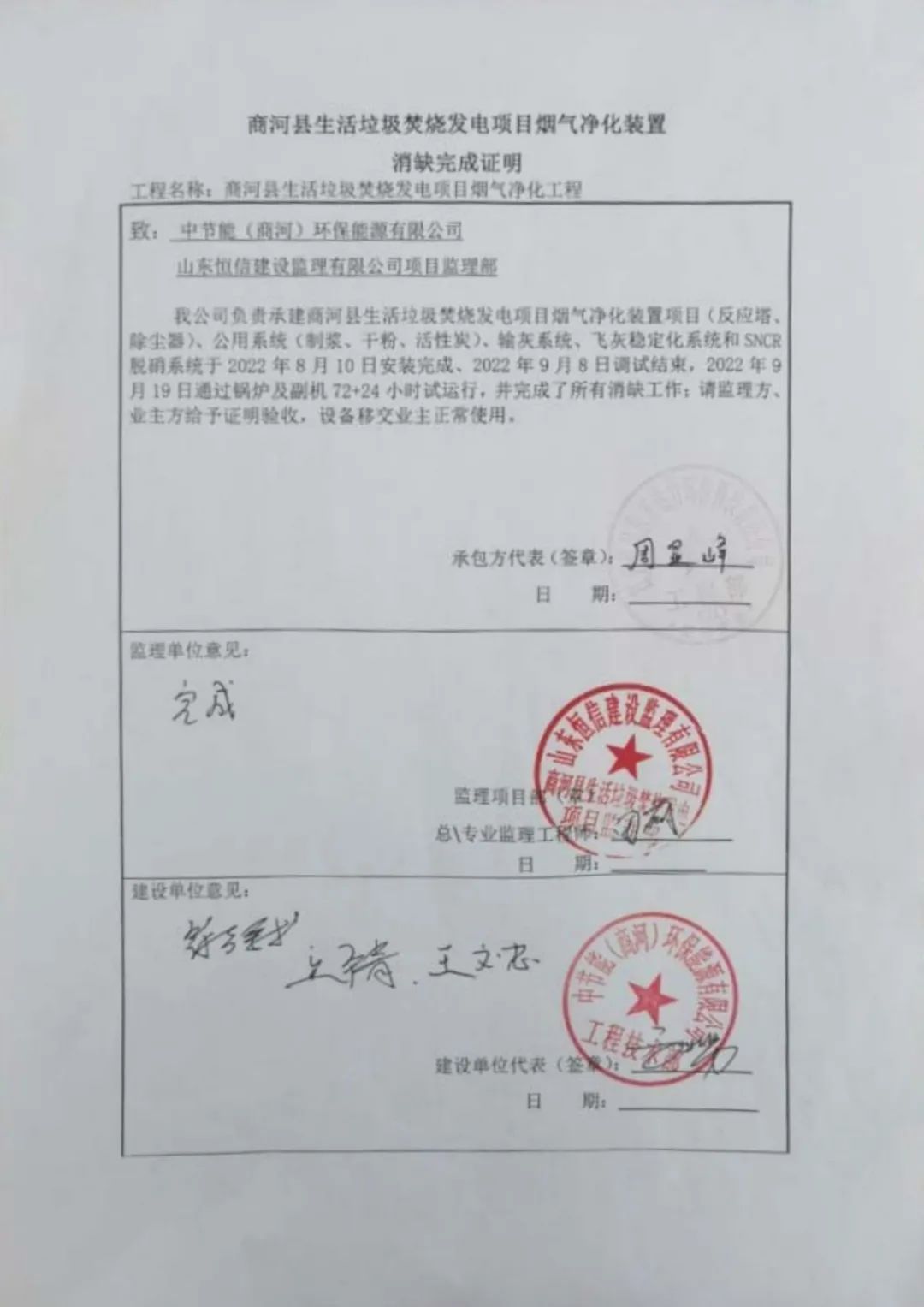 我公司承建的山東省濟(jì)南市商河生活垃圾焚燒發(fā)電項(xiàng)目煙氣凈化工程于2022年09月19日通過72+24小時(shí)試運(yùn)行。 The FGC project undertaken by Huaxing for Shanghe WTE plant in Jinan, Shandong passed 72+24 hours trial operation on September 19, 2022.